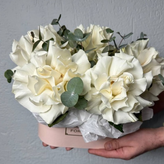 Композиция из белых французских роз и эвкалипта олицетворяет изысканность и утонченность. Нежные лепестки роз создают атмосферу легкости и чистоты, символизируя искренность чувств и чистоту намерений. Эвкалипт добавляет композиции свежесть и природную энергию, подчеркивая гармонию природы. Такое сочетание цветов идеально подходит для выражения нежных эмоций и восхищения красотой окружающего мира.